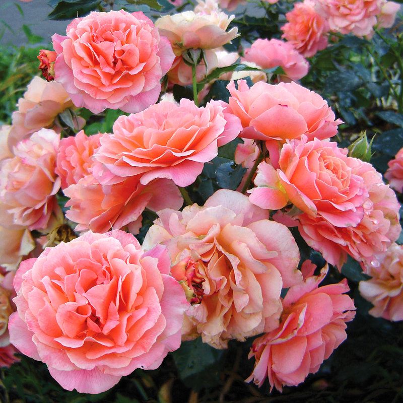 Густой, невысокий, обильно цветущий коралловыми цветами хорошо нарастающий округлый куст. Бутон медно-оранжевый, яйцевидный. Цветок абрикосово-оранжевый с желтым центром, в полном распуске становится коралловым . Чашевидный до розетковидной формы , махровый, 17 — 25 лепестков в одном цветке, диаметр цветка 4 — 6 см, с легким ароматом. Цветение очень обильное, непрерывное, до поздней осени, цветки собраны в крупные соцветия, на одном цветоносе в период массового цветения по 5 — 8 цветков одновременно.